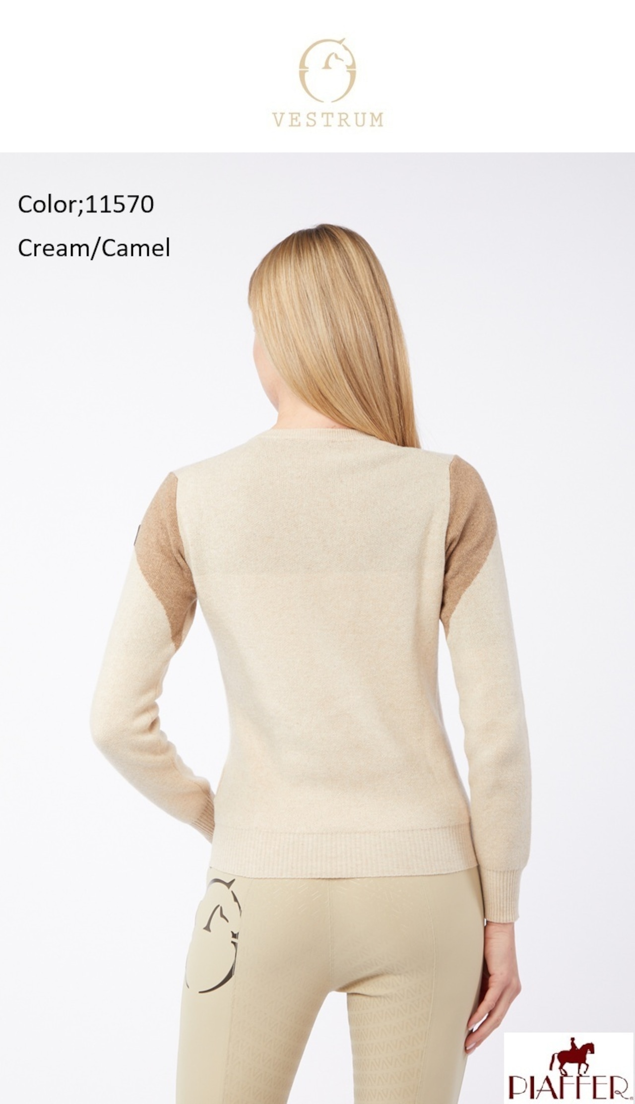 デザインにおいては、女性らしいシルエットを引き立てるスタイルが魅力です。セーターにはたてがみと手綱が付いた馬の形をした装飾が施されています。リブ編みの袖口と裾が施されており、動きやすさとともに洗練された印象を与えています。さらに、左胸にはトレンドを感じさせるVestrumのロゴが入っており、細部にまでこだわりを見せるデザインです。