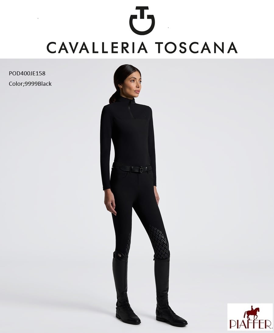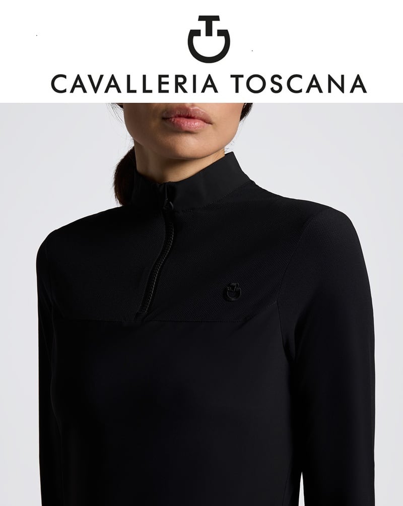 Cavalleria Toscana 女性用長袖トレーニングポロシャツ(ジャージー、パーフォレイドインサート付き)は、高性能かつモダンなスタイルを兼ね備えて設計されています。伸縮性のあるテクニカルジャージ製で、最も激しいセッションでも通気性と快適さを保証します。デザインは袖と肩に穴あきインサートを施し、通気性を高め、スポーティで決断力のある美観を演出しています。衣服は、熱封されたハーフジップ、ハイカラー、そしてトーン・オン・トーンの熱付けカヴァレリア・トスカーナのロゴで完成しています。機能性と洗練を兼ね備えたテクニカルなポロシャツで、現代の乗馬にふさわしいデザインです。